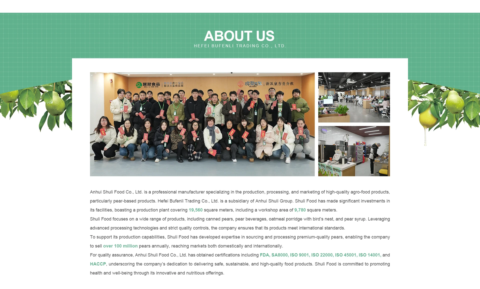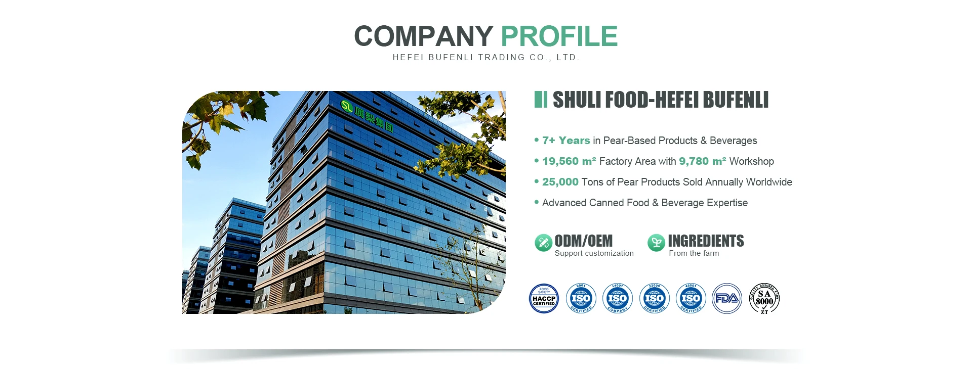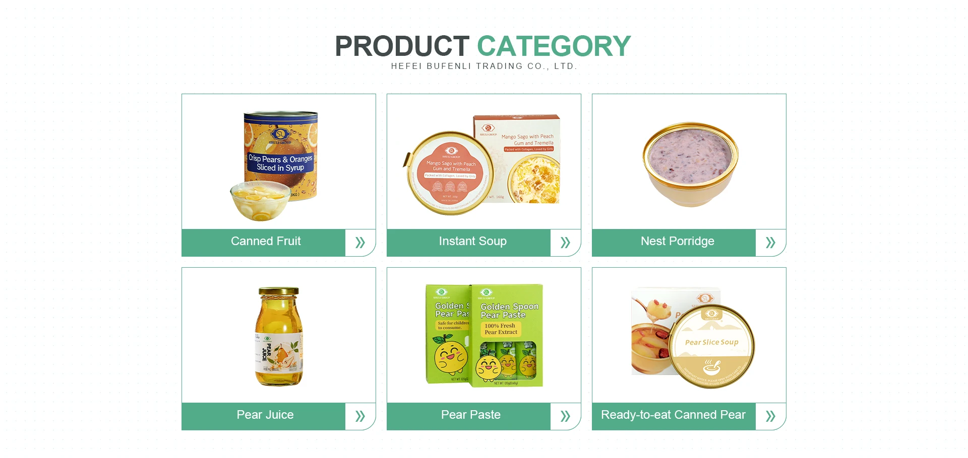 Prodotti principali: Frutta in scatola, pera in scatola pronta per il consumo, zuppa istantanea, succo di pera, pasta di pera